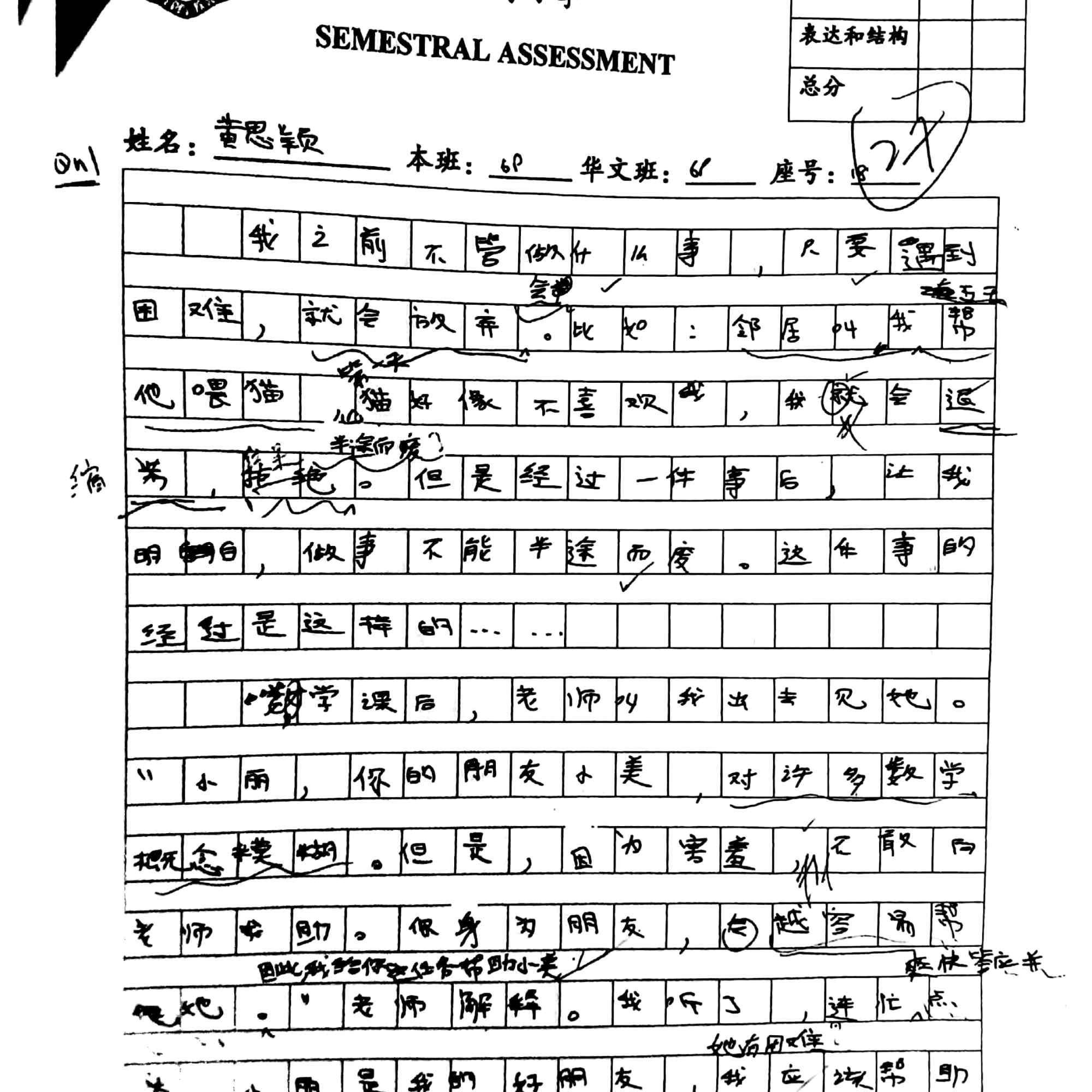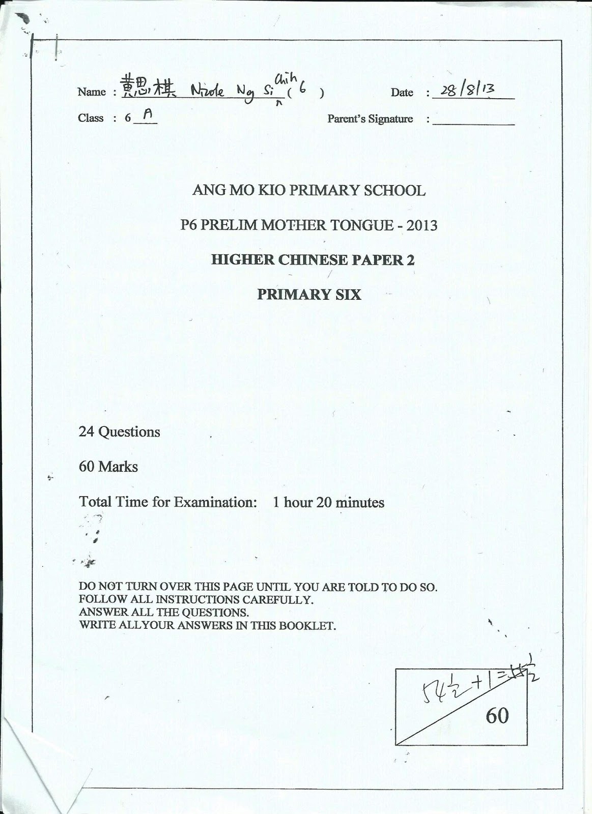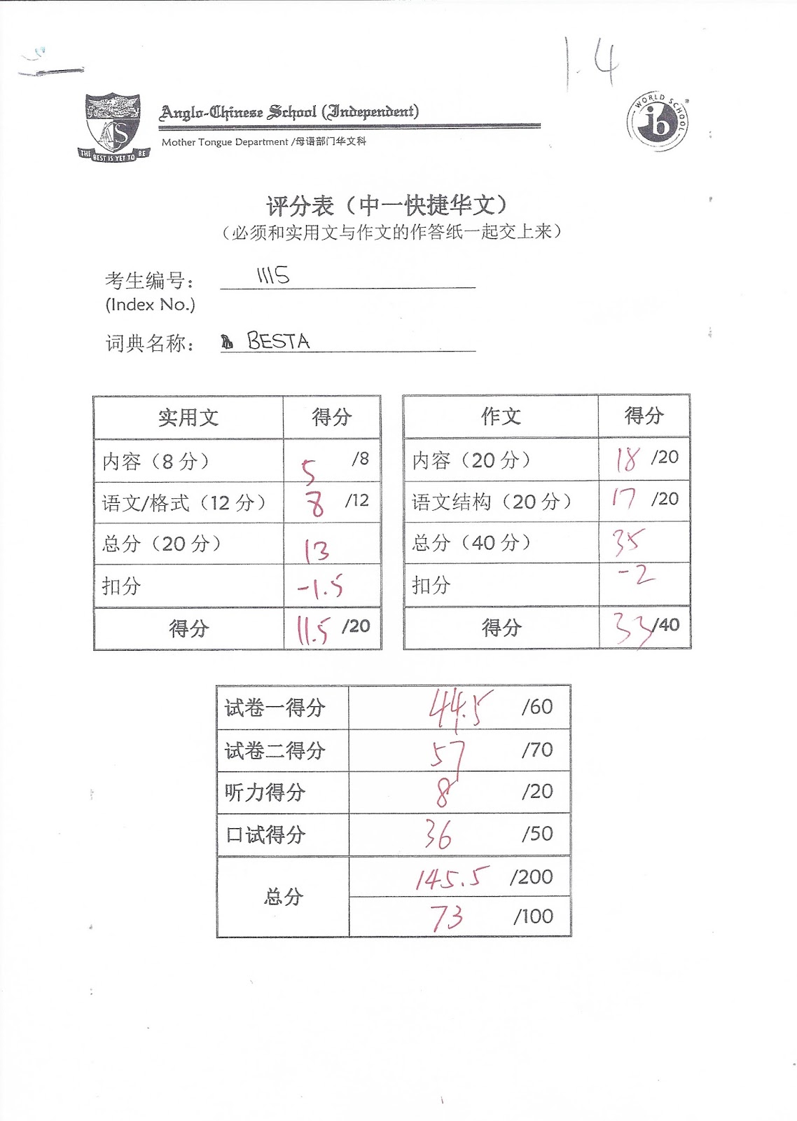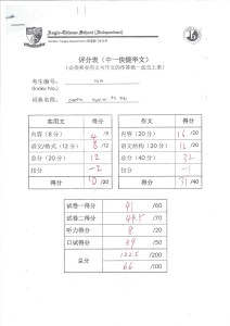 Paper 1 (Composition) 37 / 60 (2nd highest in class, highest in class is 38 / 60)