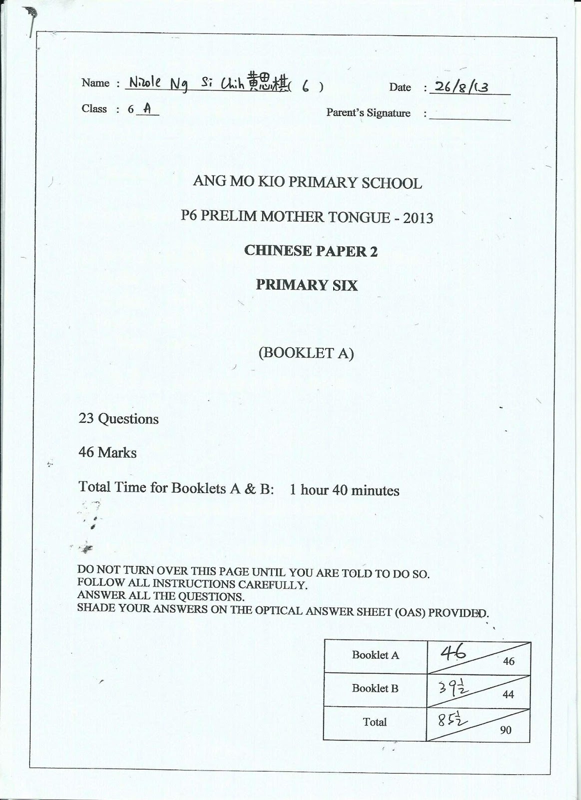 PSLE Chinese Result A
