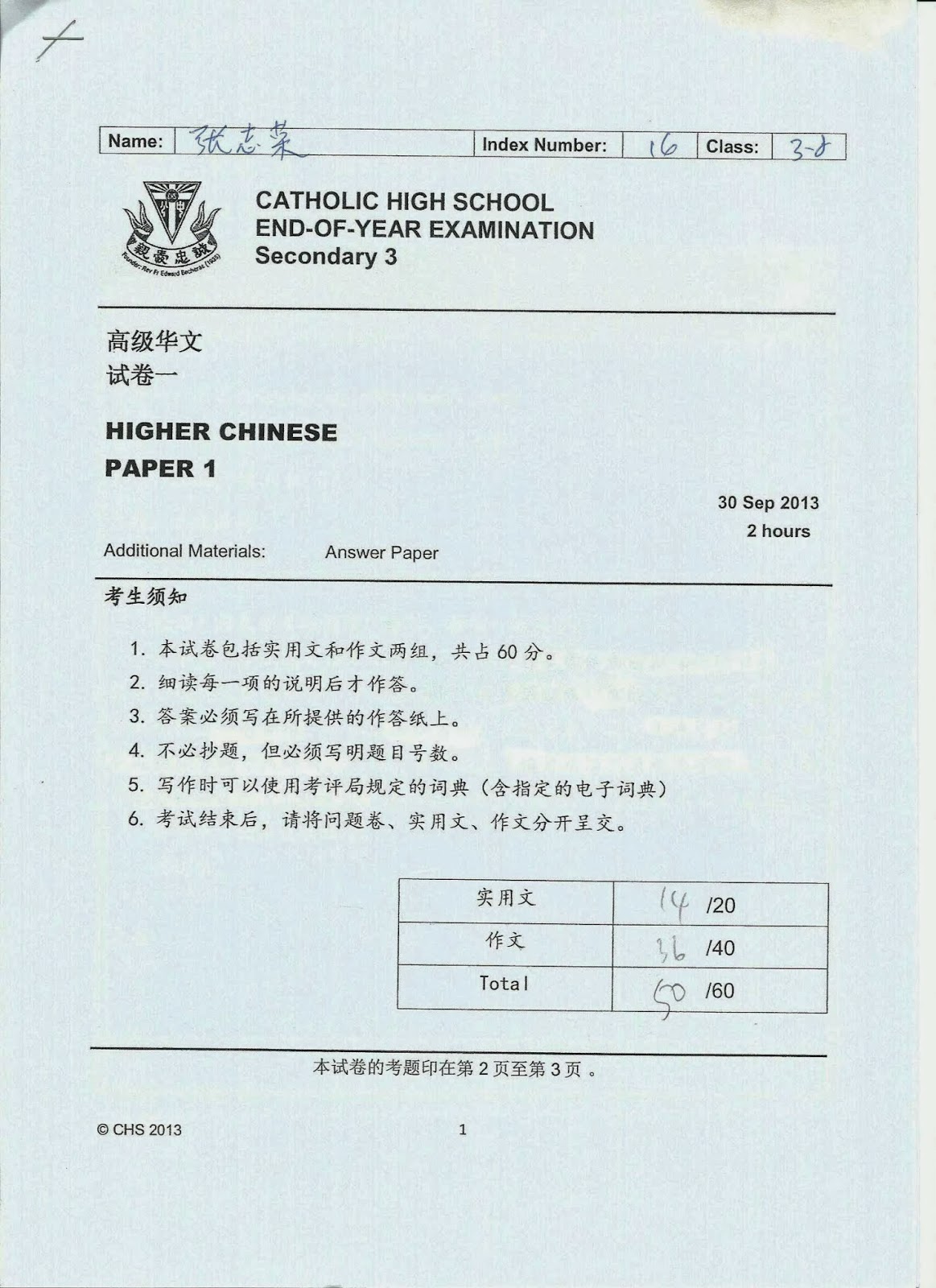 2014 Sec 3 SA1 Higher Chinese